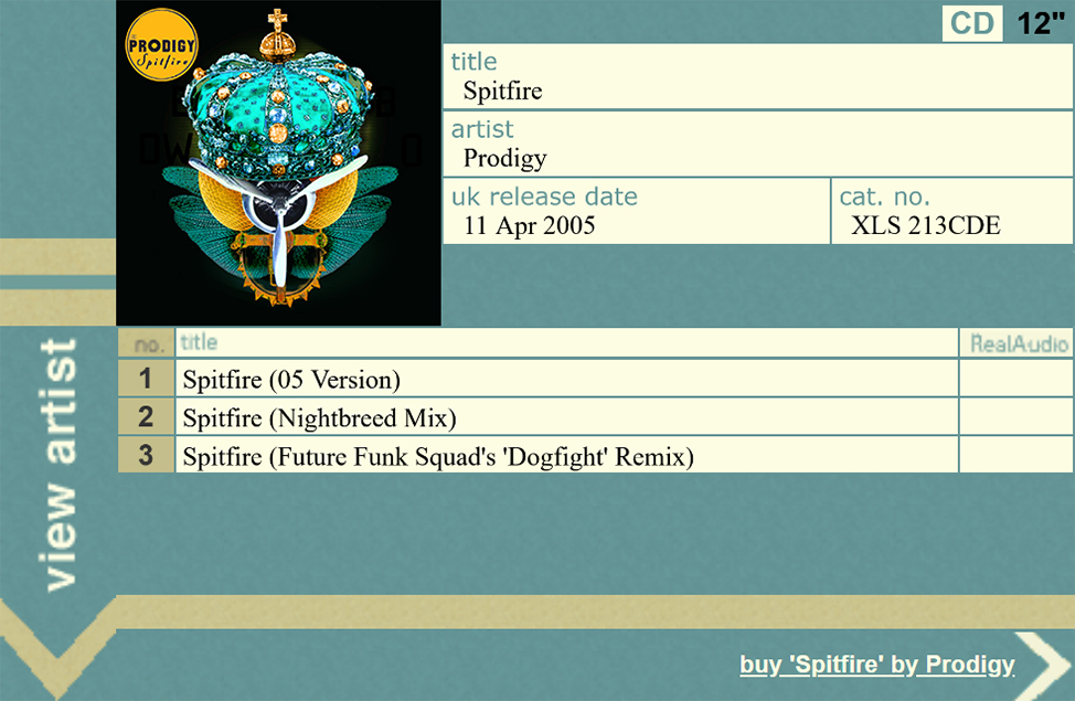 Official Press Release: “The Prodigy release ‘Spitfire’, their new single via 12” and download on Monday the 28th of March 2005. The single, from their chart topping ‘Always Outnumbered, Never Outgunned’ album, is backed with two unique, DJ friendly remixes. Lead track, the 05 version of ‘Spitfire’, is a punked-up, militant reworking of the album track and live favourite. Following the success of their ‘Pack Of Wolves’ track, Liam Howlett asked Ram Records’ Nightbreed to provide a drum’n’bass take on the single. In contrast to this, Future Funk Squad’s Dogfight mix is a nu skool breaks classic, already picking up plays on the nation’s airwaves.”